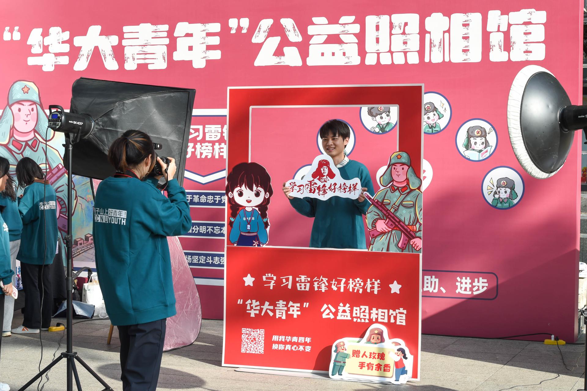 “华大青年传媒中心”曾于2022年7月前往“坝头库首第一村”开设“公益照相馆”,为乡亲们免费拍摄生活照,被《人民日报》报道。在“第60个学雷锋纪念日”之际,“华大青年”公益照相馆赓续雷锋精神,继续为师生办实事。在活动现场,他们自行设计、搭建“学雷锋”主题展板、合影墙,免费为广大师生、青年志愿者拍摄1000余张照片,用镜头定格美好,将奉献故事传唱。
